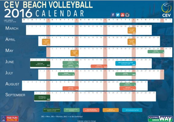 V úterý vydala organizace CEV nový kalendář beachvolejbalu pro letošní rok. Kalendář bude mít pro českého fanouška dva hlavní vrcholy a to mistrovství Evropy začátkem června, které se bude konat ve Švýcarsku, a finále Continental Cupu ve dnech 23. – 26. června, které se je programu v Norsku. Právě na tomto turnaji bude Česká republika v obou kategoriích bojovat o letenku na Olympijské hry do Ria de Janeira.