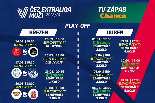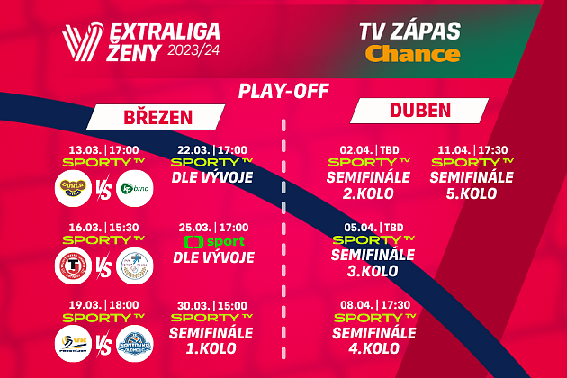 Již ve středu 13. 3. 2024 započnou boje ve čtvrtfinále play-off volejbalové extraligy žen 2023/24, o den později se rozehraje čtvrtfinále ČEZ volejbalové extraligy mužů 2023/24. Níže najdete přehled utkání vysílaných na ČT Sport a nově také na Sporty TV. Všechna utkání můžete sledovat také na Volej.TV.
