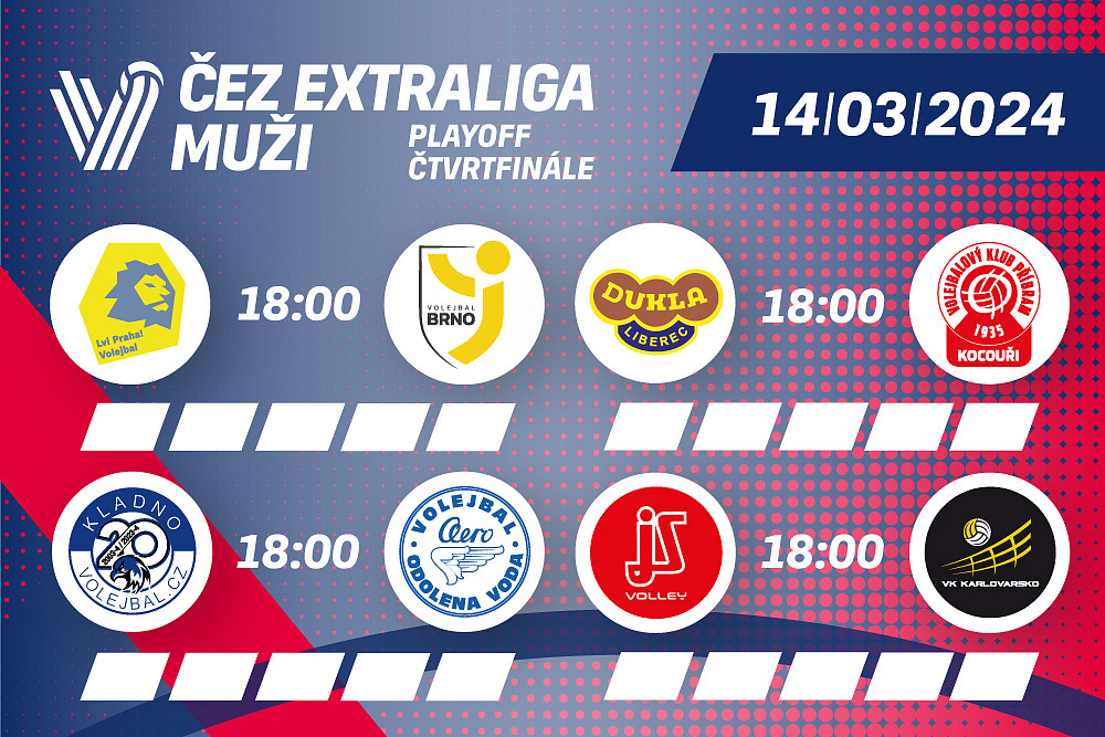 Šest nejlepších týmů základní části ČEZ volejbalové extraligy mužů 2023/24 a dva vítěze předkola čekají první zápasy čtvrtfinálové série play-off. Výhoda domácího prostředí je na straně lépe umístěných týmů v dlouhodobé části soutěže.
