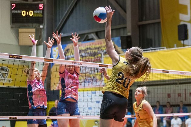 Start sobotního duelu byl v režii Olomouce, ta blokem zvyšovala už na 4:1. Domácí hráčky držely vedení ve svých rukou, Prchalová u sítě smečovala a zvyšovala na 7:4. Brňanky se i tak udržovaly v kontaktu a obě strany na střídačku bodovaly. KP snížilo na rozdíl jednoho bodu, Olomouci se náskok dařilo dál držet, a to zásluhou Prchalové a Josefíny Smolkové. Pohotovou reakcí u sítě Olomouc zvýšila na 15:12, Popić následně zasadila úder při snížení na 14:16, Brňankám se poté povedlo srovnat na 16:16. Do vedení se Jihomoravanky nedostaly a Olomouc naopak znovu vedení navyšovala. KP Brno si tak za stavu 19:16 bralo oddechový čas. Oba celky odehrály poté dlouhou výměnu a po mnoha soubojích mělo 17. bod KP. Následně hostující celek snížil na 18:19 a Olomouc zareagovala oddechovým časem. Bojovností při výměnách se Brno dostalo znovu k vyrovnání, ale Olomoučanky byly stále ty, které držely náskok. Hanačky už odskočily na 23:19 a KP Brno si bralo druhý oddechový čas. Brno chtělo ještě něco se stavem udělat, ale zásah kapitánky Trnkové udělal tečku za prvním setem, 25:20.