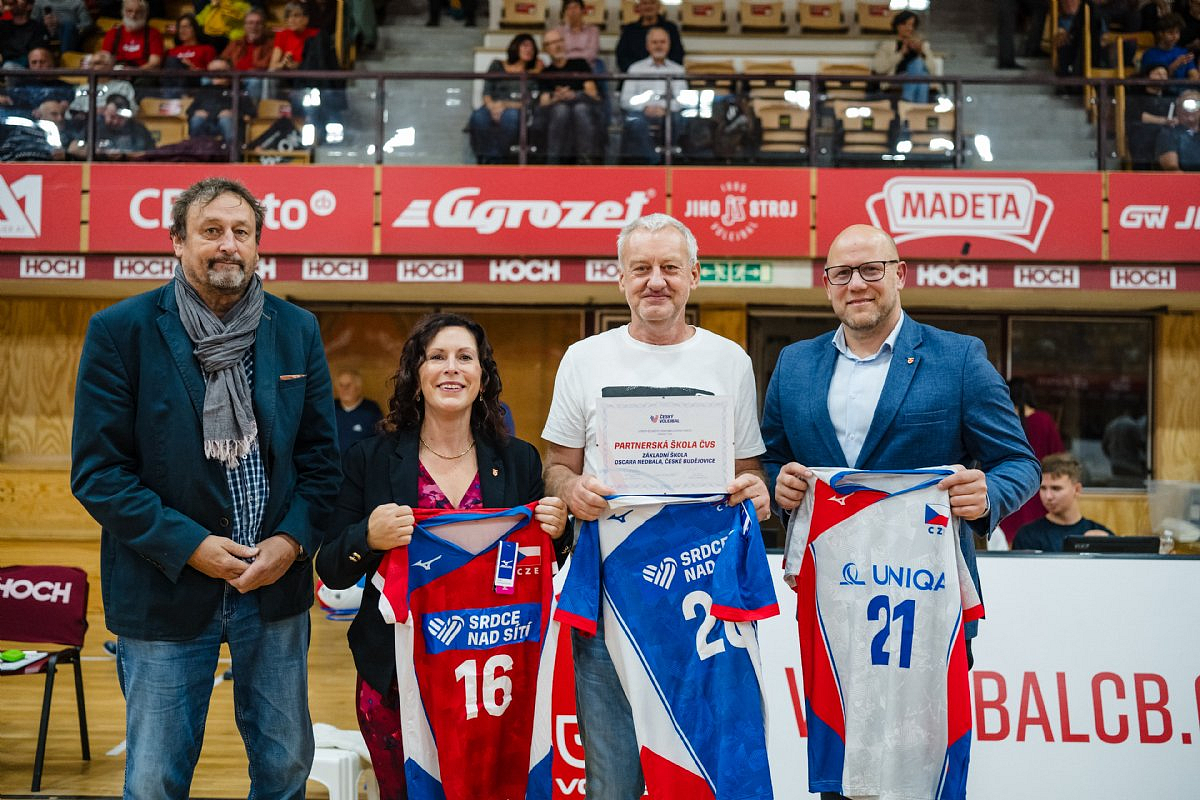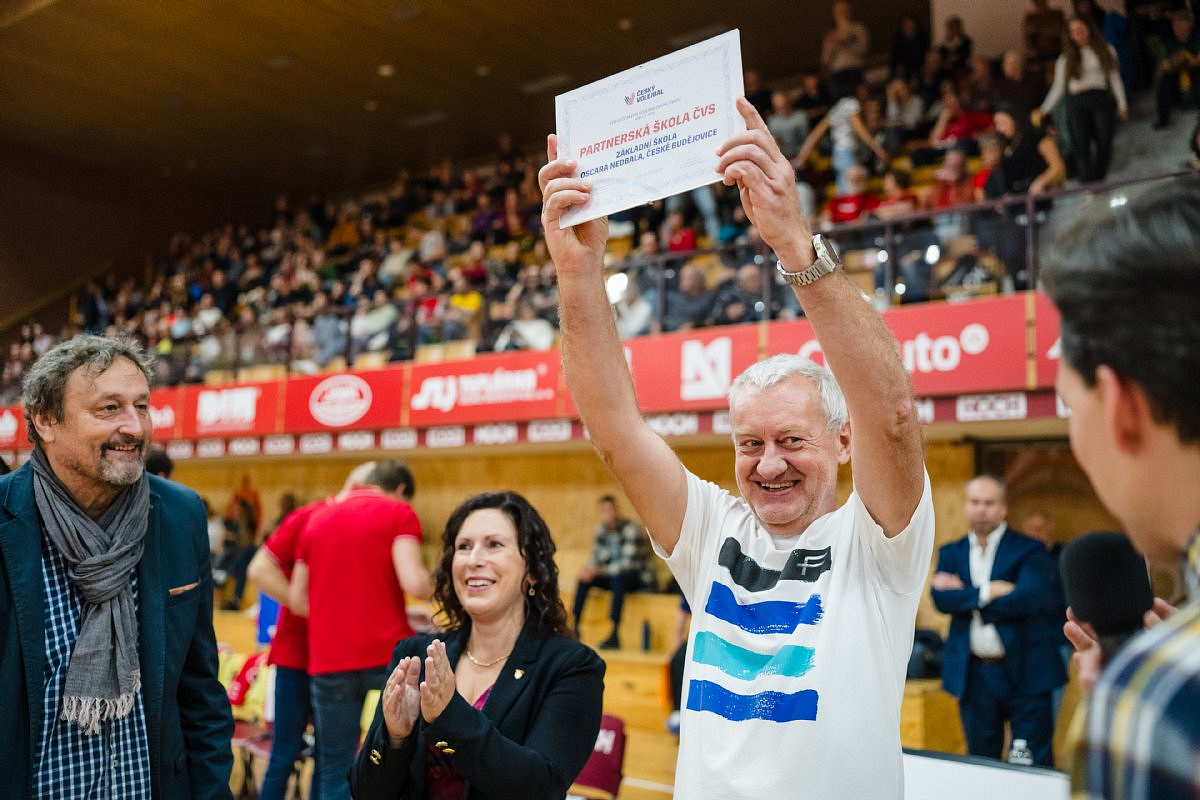 Pokud v titulku „Předání titulu Partnerská škola ČVS“ ZŠ Oscara Nedbala v Českých Budějovicích, uvádím slovo „trochu“ v uvozovkách, evokuji tím opravdu, že předávání bylo jiné. Většina předání titulu PŠ ČVS proběhne na školách či radnicích a většinou v úzkém kruhu zúčastněných. Tentokrát se předání titulu uskutečnilo v atraktivních kulisách sportovní haly a zúčastnilo se ho skoro 2000 diváků extraligového utkání mužů mezi VK České Budějovice versus VK Kladno v sobotu 26. 10. 2024.