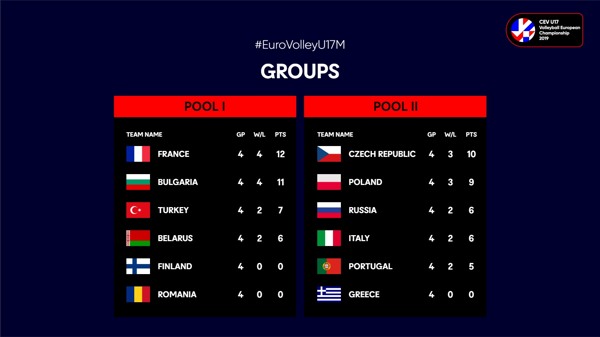 Po odehrání základních skupin postupují do bojů o medaile (1-4) z každé skupiny první dva týmy, třetí a čtvrtý v pořadí bude hrát o 5. – 8. místo. Zatímco v naší skupině rozhodnou o postupujících výsledky zítřejších zápasů, v druhé skupině je už vše jasné.