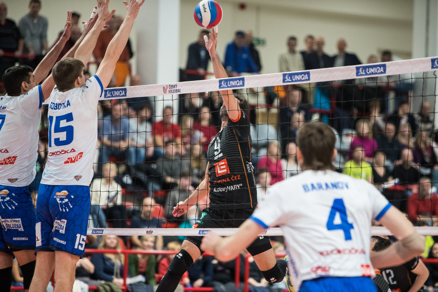 Diváci v zaplněné kutnohorské hale Klimeška mohli vidět velmi vyrovnaný souboj zkraje třetího dějství. Za stavu 9:10 se předvedl Filip Habr ulívkou na druhou přes. Na karlovarského Rejlka si počkal jednoblokem kapitán Orlů Tomáš Hýský a skóre mluvilo právě ve prospěch jeho týmu - 13:10. Na to reagoval hostující kouč timeoutem. Karlovarsko následně také změnilo režiséra hry - na palubovku se dostal Matyáš Džavoronok. Do čtyřbodového vedení posunul Eagles Sergei Baranov - nejprve technickou zalívkou a následným esem na lajnu (16:12). Do koncovky pak vstupoval kladenský tým díky dvěma blokům Sobotky v řadě za stavu 20:17. Hned dvakrát v řadě také ukázali zdejším diváků svou sehranost Moník s Hýským - kladenské libero nahrálo svému kapitánovi za hlavou na hlavní kůl, ten si následně poradil s jednoblokem. Na závěr dvěma esy v řadě rozhodl kladenský Vemič a ukončil třetí set 25:18.