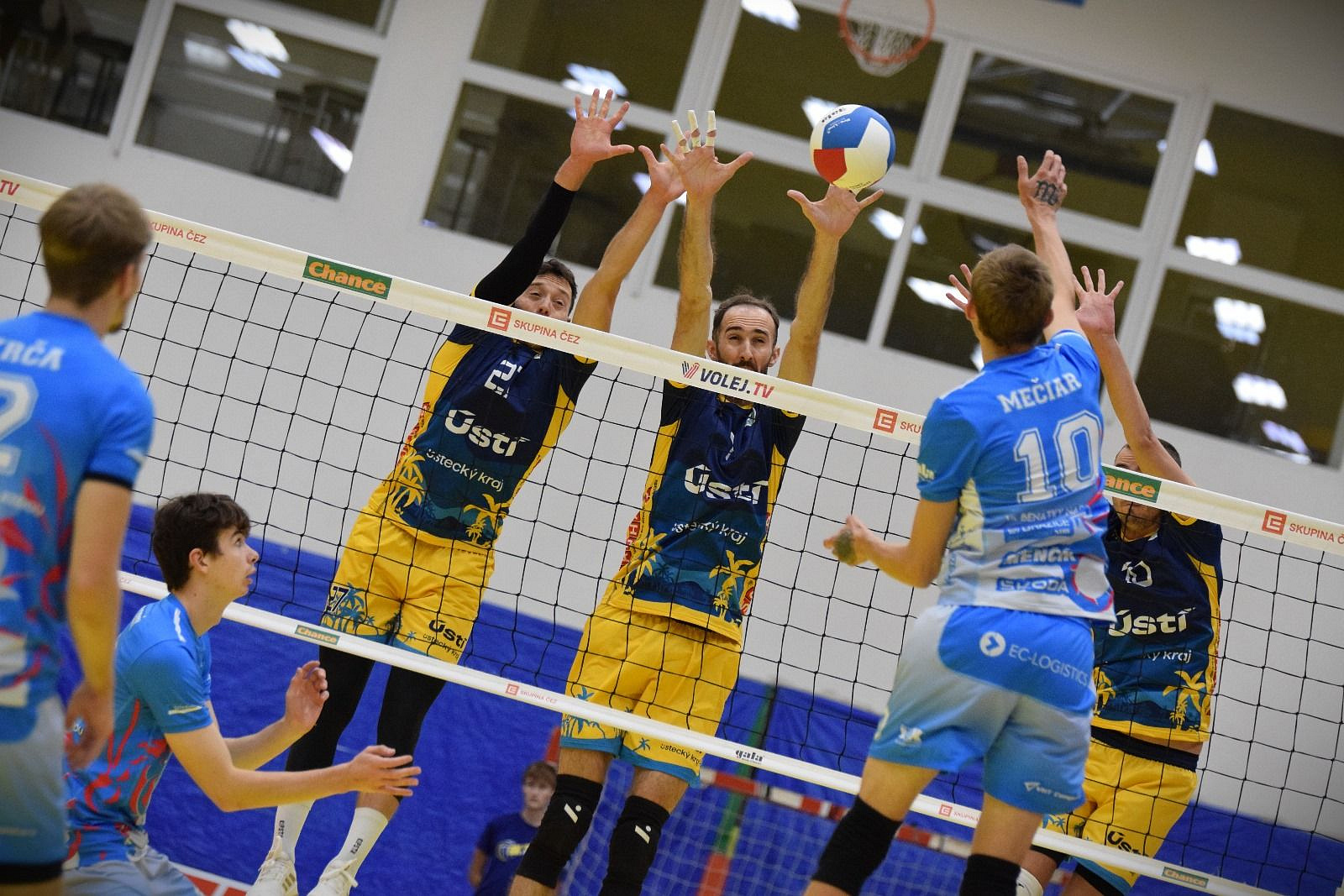 Do prvního zápasu letošního Chance Českého poháru vstoupily oba týmy s nadšením. Začátek prvního setu byl velmi vyrovnaný. Ústečtí volejbalisté lépe začali a drželi si jednobodový náskok. Na zvýšené vedení 13:9 reagoval trenér hostů prvním oddechovým časem. Domácí ale nenechali soupeře vydechnout. Hráči z Benátek se alenevzdávají a snižují na 14:12. Ústí za stavu 16:14 střídá, do hry přichází Tomáš Hendrich. Úžasný blok kanadské posily zvyšuje skóre na 18:14 a na to odpovídá trenér Benátek dalším oddechovým časem. Po oddechovém čase přichází přímý bod z podání domácích, o který se zasloužil Wellington Bolzani. Hosté se stále nevzdávají a snižují na 20:18, kdy nezbývá Ondrovi Žabovi nic jiného, než si vzít svůj první oddechový čas. Oddechový čas byl účinný a Benátky kazí svůj servis. Ústí od výhry prvního setu dělí pouze dva body. Úžasný blok domácího kapitána zajistil výhru prvního setu 25:20.