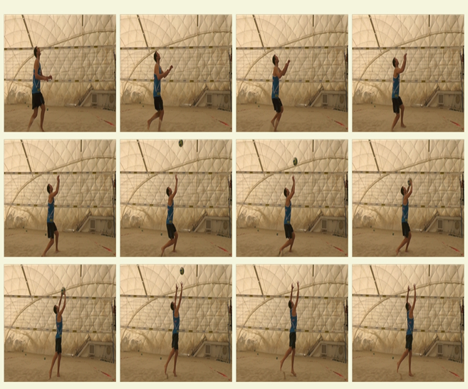 V okamžiku těsně před dopadem míče do prstů se zápěstí mírně zvrátí vzad. K odbití dochází články volně roztažených prstů. Dlaně se míče prakticky nedotýkají. Při odbití se nejvíce zapojují palec, ukazovák a prostředník. Zvýšením těžiště a propínáním loktů do vzpažení mírně vpřed dokončí hráč odbití. Pohyb obou paží je synchronizovaný a navazuje na pohyb nohou a trupu. Rozfázovaná činnost hráče při nahrávce viz. obrázek 3.