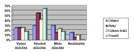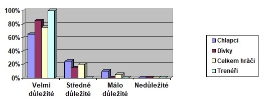 Výsledky odpovědí vyšly prakticky shodně. Všechny skupiny považují dobrou atmosféru v týmu jako velmi důležitý motivační činitel. Odpovědi dívek a trenérů se shodují, 90 % považuje tento faktor za velmi důležitý. U chlapců bylo zjištěno 80 %.