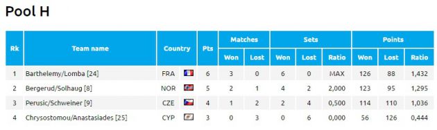 | 14.7. | Barthelemy/Lomba FRA [24] | Chrysostomou/Anastasiades CYP [25] | 2-0 (21-6, 21-10) |