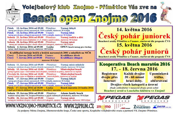 Volejbalový klub Znojmo - Přímětice Vás všechny srdečně zve na Beach open Znojmo 2016. Více informací naleznete v pozvánce ZDE.