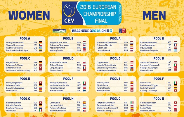 Markétu Slukovou s Barborou Hermannovou čeká na šampionátu v základní skupině silný německý pár Ludwig/Walkenhorst, Řekyně Arvaniti/Karagkouni a dvojice Dumbauskaite/Pavilaityte z Litvy. Kristýna Kolocová s Míšou Kvapilovou se pak utkají se Španělkami Liliana/Elsa, Finkami Lehtonen/Lahti a ruskou dvojicí Moiseeva/Syrtseva.