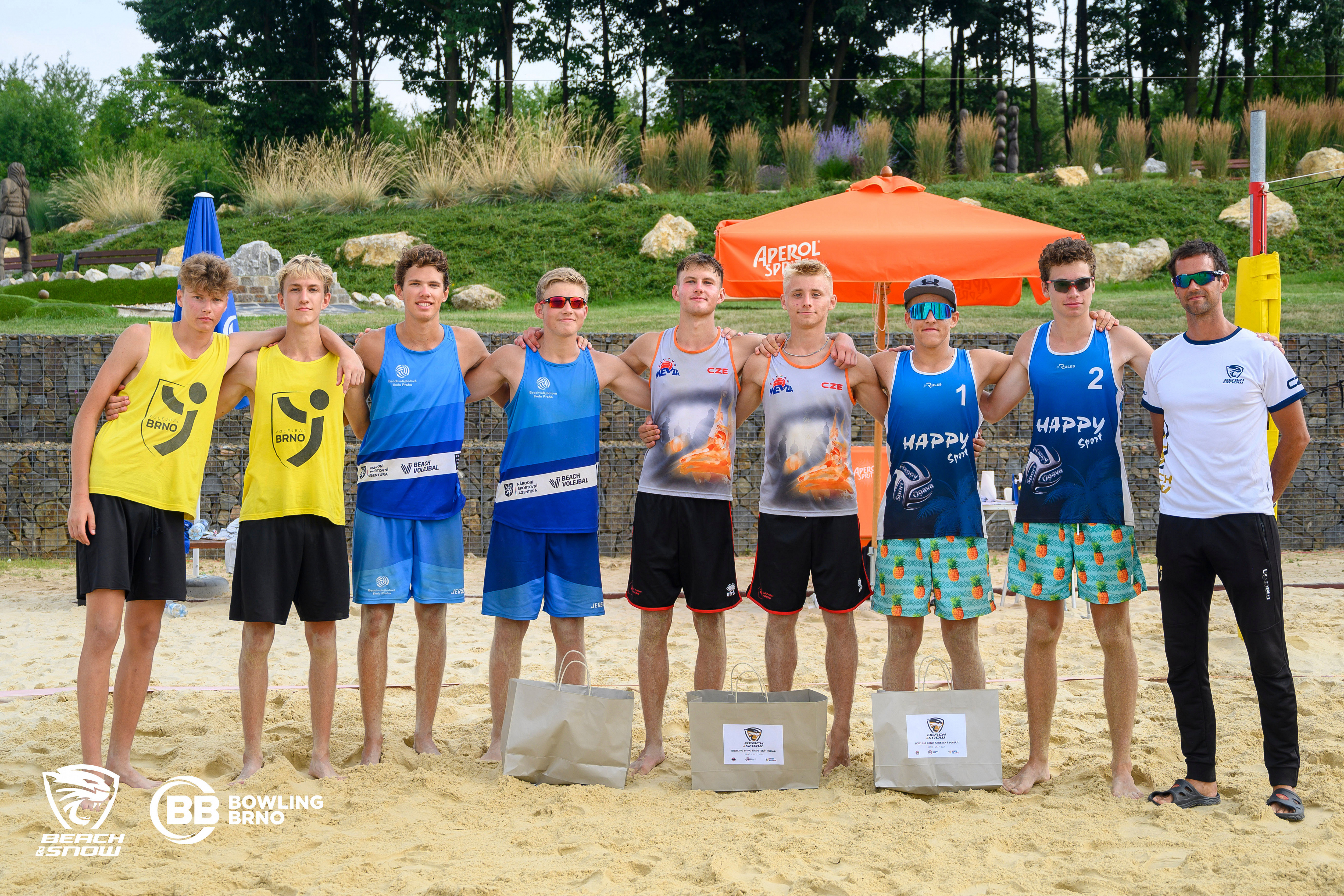 Ani deštivé ráno nezastavilo Bowling Brno kadetský pohár, kterému patřila celá neděle. Do nového, především bowlingového areálu se sjelo celkem osm párů z doslova celé republiky - nasazené jedničky z Opavy, naopak beachvolejbaloví nováčci z Ústí nad Labem. Dvě čtyřčlenné skupiny rozehrály Kadetský pohár ještě v dešti, ten ale v průběhu základních skupin vystřídalo slunečné počasí. Opavští Michal Přibyl s Tadeášem Lexem stejně jako pražští Lvi Richard Čermák s Josefem Vodičkou vyhráli své základní skupiny a postoupili do play-off z prvního místa. Z druhých míst šli do vyřazovacích bojů hráči domácího týmu Beach&Snow Volley Team Tomáš Křenek s Tadeášem Milichovským a Adam Pařenica s Matyášem Pokorným - ti se nakonec nedokázali probojovat do semifinále, ve dvou setech podlehli páru Filip Rydval / Jan Neuschaefer. Právě pražští hráči porazili i druhý brněnský tým, tentokrát tím nejtěsnějším možným rozdílem (15:13) v tiebreaku a skončili třetí. Také finálové utkání přineslo třísetovou bitvu, z výhry a ovládnutí celého turnaje se nakonec radoval pár Michal Přibyl / Tadeáš Lex, a to po výhře 2:1 (19, -23, 11) nad Richardem Čermákem a Josefem Vodičkou.