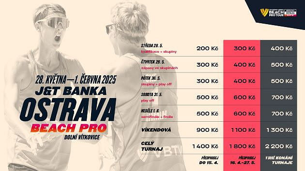Nejlepší světový beachvolejbal a bohatý doprovodný program v unikátním prostředí Dolních Vítkovic, to již poosmé nabídne J&T Banka Ostrava Beach Pro. Turnaj v termínu 28. 5. – 1. 6. 2025 přiláká do Ostravy ty nejlepší světové týmy v čele s olympijskými vítězi. Domácím fanouškům, kteří jistě znovu vytvoří bouřlivou atmosféru, se představí čeští mistři světa Ondřej Perušič s Davidem Schweinerem. V kvalifikaci i hlavní soutěži do bojů zasáhnou další tři české páry. Vstupenky jsou k dostání v síti Ticketportal.