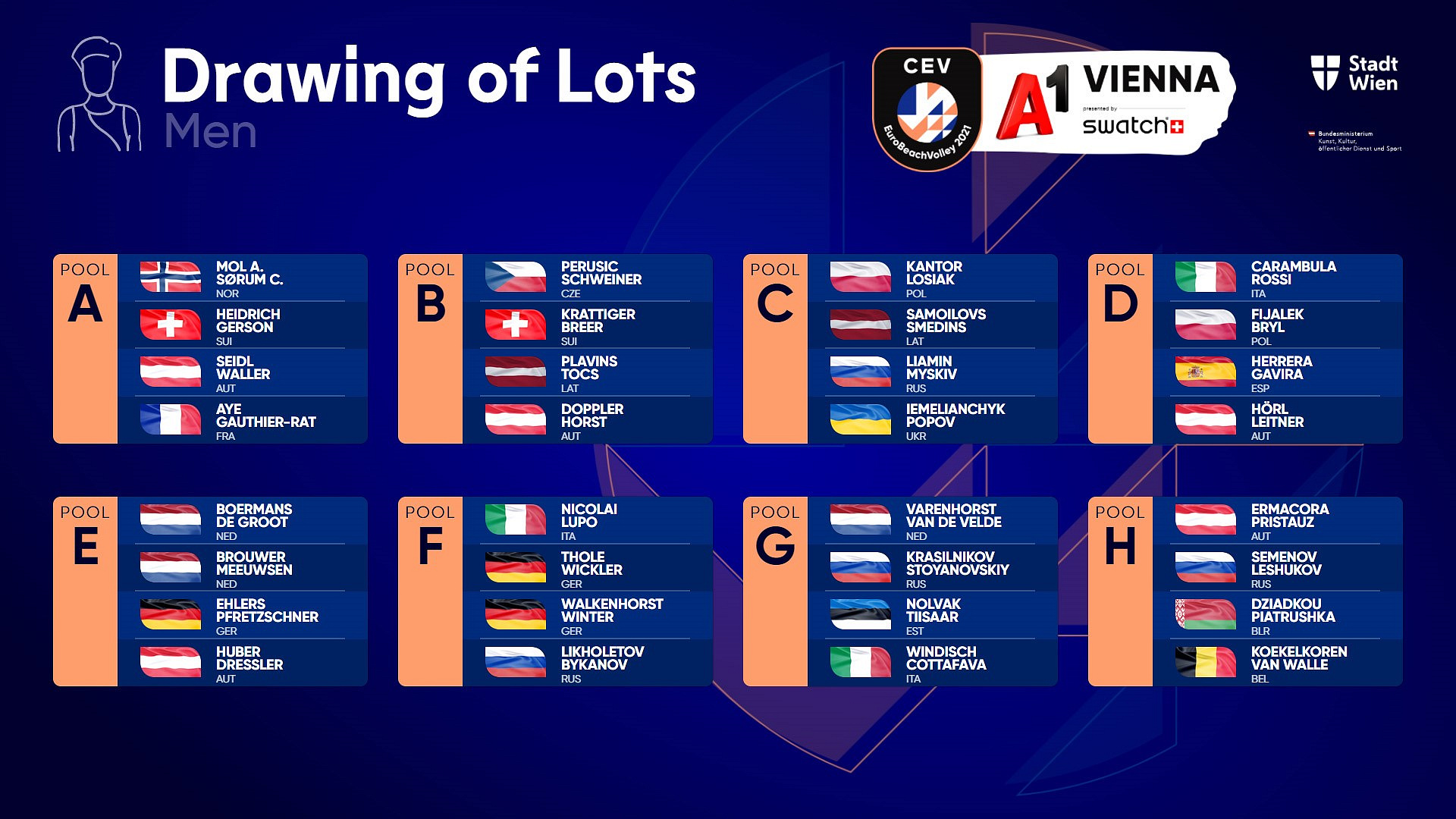 Trochu ve stínu nadcházejících OH, proběhlo losování ME 2021. Naše barvy budou hájit dvojice Markéta NaschSluková / Barbora Hermannová, Michala Kvapilová / Michaela Kubíčková a v mužské kategorii pouze Ondřej Perušič s Davidem Schweinerem. Letošní ME bude hostit Vídeň ve dnech 11. - 15. srpna 2021. Do Vídně je kousek, takže se naše dvojice mohou těšit velkou diváckou podporu z hlediště. Více o ME 2021 najdete ZDE