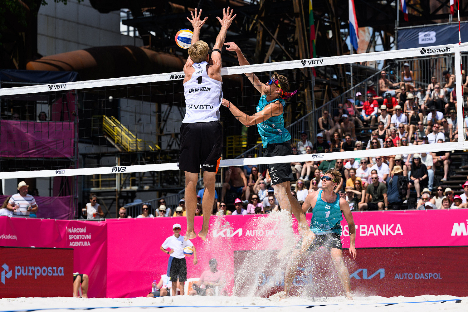 Volejbalová štěstěna se na stranu soupeřů přiklonila i v zápase českých jedniček. Perušič se Schweinerem nechytli začátek zápasu s Němci, kteří jim rychle utekli na 11:6 a náskok již nepustili. A to i za pomoci hned tří „prasátek“, z nichž jedno ukončilo první set. V druhé sadě však Češi hráli jako vyměnění. Zpřesnili své útoky, úspěšně odrážely ataky Němců a vítězstvím v druhém setu si vynutili tiebreak. Do toho vlétli velmi energicky. Bohužel nevyužili míč na vedení 5:2 a nakonec Němcům podlehli 15:11.