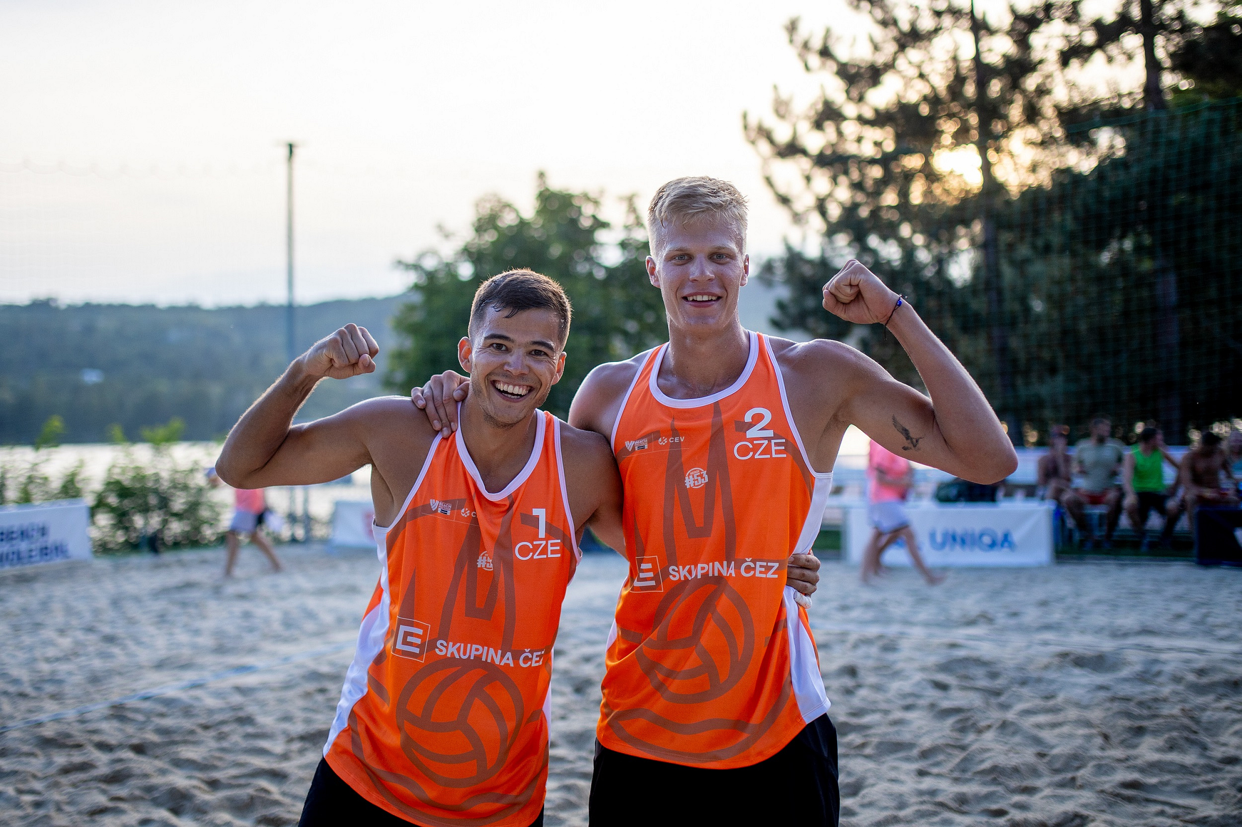Jan Dumek s Jiřím Sedlákem, kteří jsou turnajovými mužskými jedničkami, si účast v semifinále vybojovali až ve čtvrtfinálovém tie-breaku, který nad Italy Alfieri / Krumins vyhráli ve velké bitvě těsně 15:13. „Už od začátku to byl hodně intenzivní zápas. Těsně jsme bohužel díky pár našim chybám prohráli první set. Ale řekli jsme si, že nic nevypustíme a popereme se o tie-break, který se nám podařilo uhrát,“ usmíval se po výhře 2:1 Jiří Sedlák. „Naši soupeři hráli výborně, byli schopni najít jiné varianty i na to, co jsme si na ně připravili. Proto jsme se s nimi trochu prali, problém nám dělala hlavně konzistence jejich obrany. Jsem rád, že jsme je nakonec přehráli,“ dodal jeho parťák Jan Dumek. Své síly změří tento český pár v semifinále v neděli v pravé poledne s norskou dvojicí Mol / Sunde. Jiří Sedlák na závěr zmínil, že by chtěl zažít sokolské finále, čímž měl na mysli svou klubovou příslušnost a možnost pikantního souboje s druhým z českých týmů v nejlepší čtyřce.