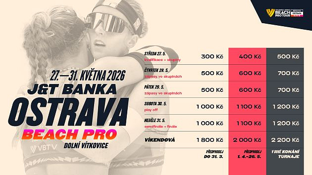 Už v úterý, symbolicky 3. 3. ve 3 hodiny odpoledne (15:00), startuje prodej vstupenek na J&T Banka Ostrava Beach Pro, turnaj nejvyšší kategorie Elite světové série World Beach Pro Tour, který se uskuteční od 27. do 31. května v ikonickém areálu Dolních Vítkovic. Pouze do 31. března platí výhodnější ceny vstupenek v předprodeji, proto není na co čekat! Předchozí ročníky ukázaly, že vstupenky na atraktivní hrací dny a víkendový vrchol turnaje mizí velmi rychle, právě již během zvýhodněné cenové vlny.