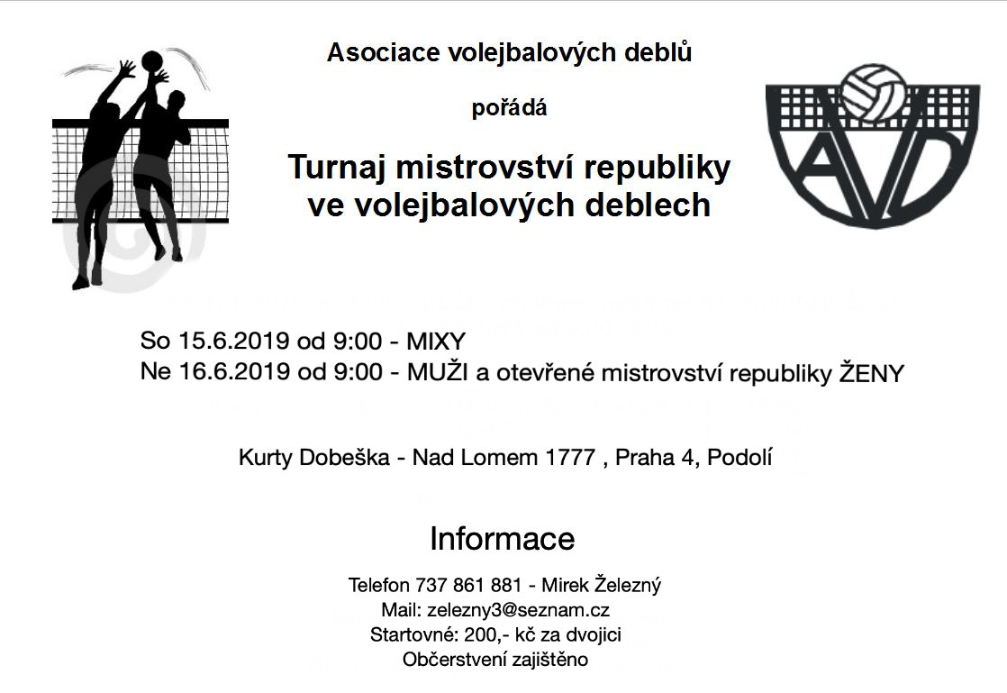 Turnaj mistrovství republiky ve volejbalových deblech v kategorii mixů a mužů a otevřené mistrovství republiky v kategorii žen na pražské Dobešce.