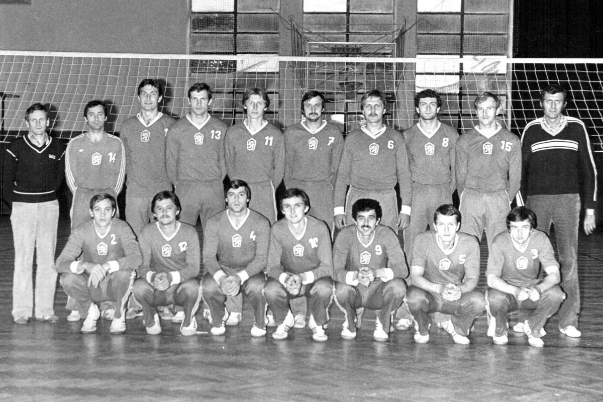 Na dalším snímku z roku 1980 širší kádr volejbalistů ČSSR pro moskevskou olympiádu. Zleva stojí as. trenéra Z. Václavík, Potáč, Prieložný, Krejčí, Pick, Lenert, Šmíd, Samek, Repák a trenér P. Schenk, v podřepu zleva Valach, Kopet, Jamka, Řeřábek, Cifra, Josef Novotný a Sirvoň.