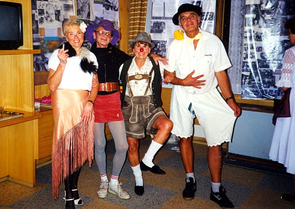 Poslední snímek vznikl při jednom z každoročních setkání našich nejstarších volejbalových „legend“ v tělovýchovném středisku Univerzity Karlovy v Dolním Poříčí u Strakonic, při kterých se navzdory pokročilému věku dokážou dodnes neuvěřitelným způsobem bavit. V roce 1998 proběhl v Poříčí půlnoční „Karneval v Riu“, zleva v kostýmech Bobina Lútočková, doc. Josef Chrástek (lékař našich volejbalových reprezentací v 50. a 60. letech minulého století), Hanka Moravcová a Milan Purnoch.