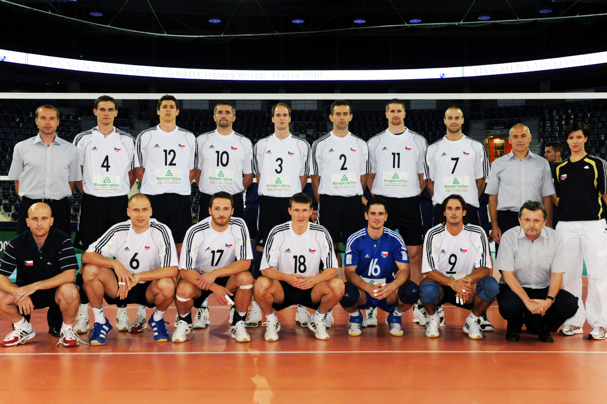 Na druhém snímku reprezentace mužů ČR v roce 2010 v rámci úspěšné kvalifikace na MS v Itálii. Nahoře zleva as. trenéra J. Svoboda, hráči Hyský, Veselý, Staněk, M. Novotný, Popelka, Štokr, Holubec, trenér Z. Haník a masérka E. Šmídová, dole zleva statistik P. Sezemský, hráči Boula, D. Konečný, Ticháček, Kryštof, Hudeček a lékař P. Juda.