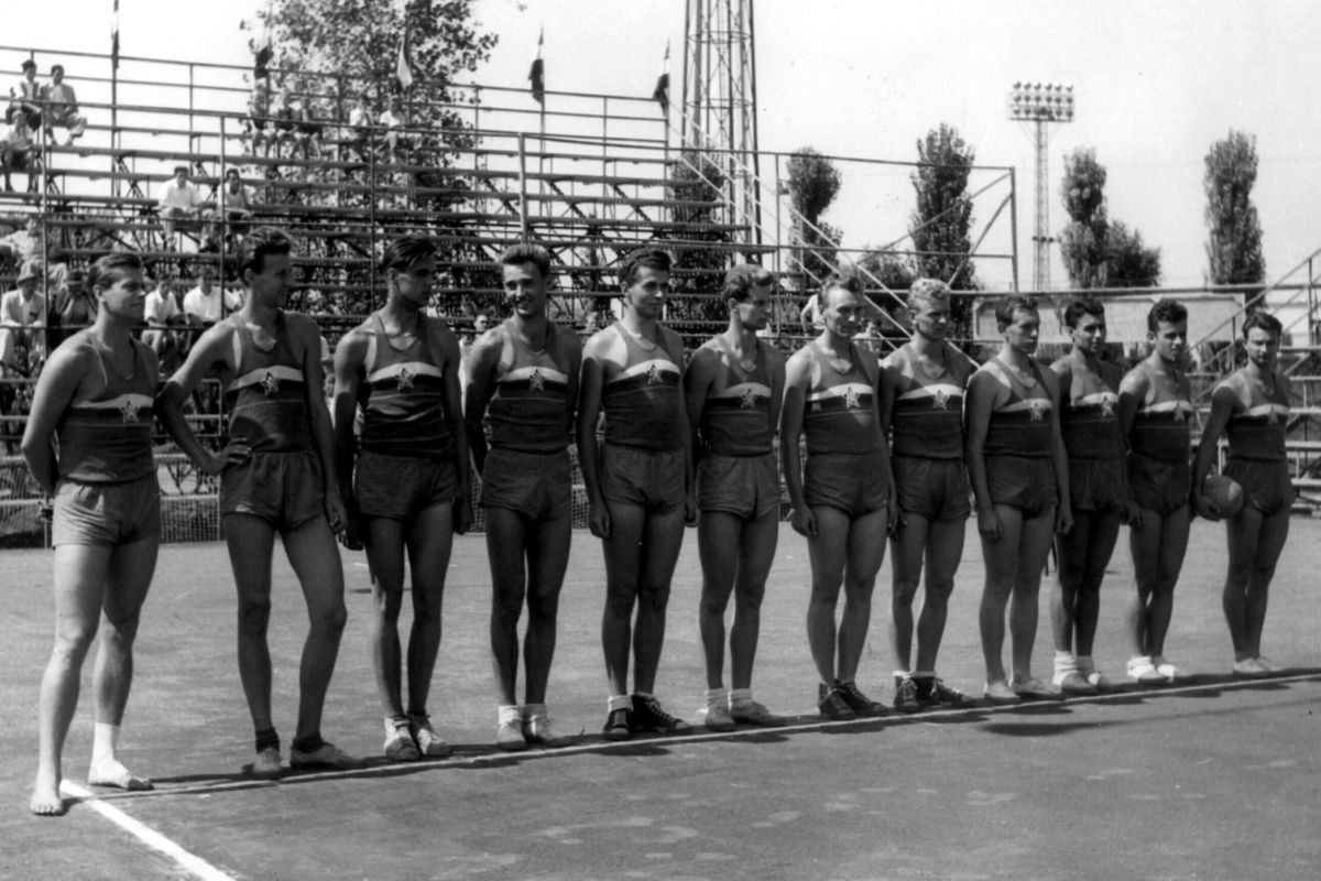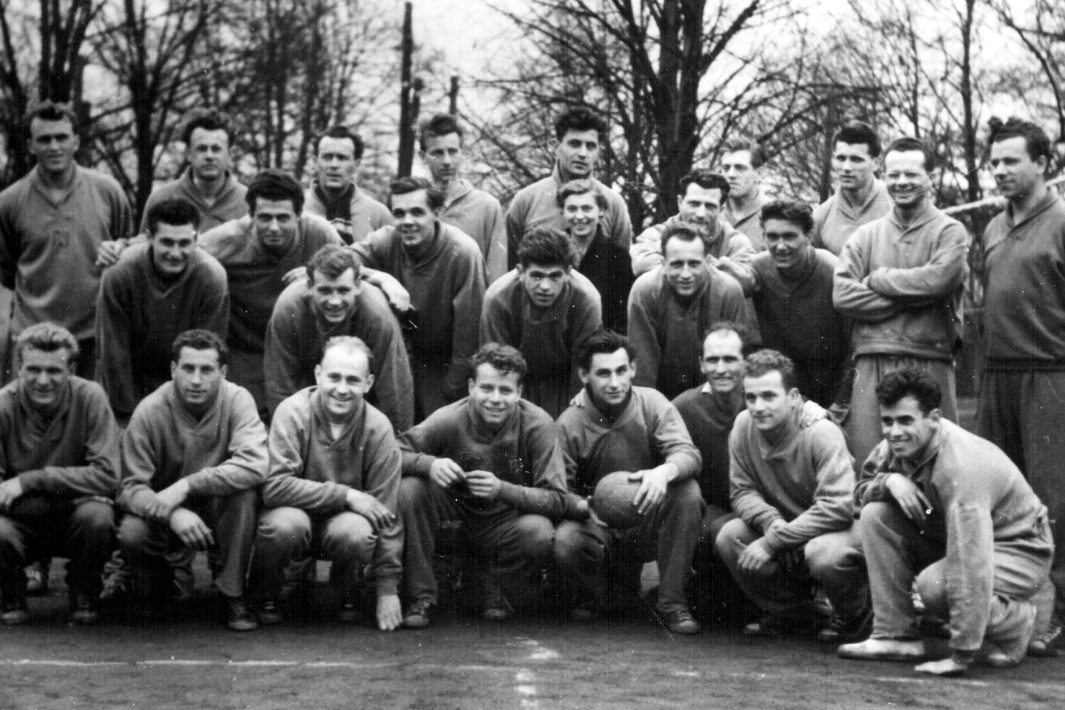 Nejcennější jubilantovou trofejí je medaile ze SALH 1954 v Budapešti a na snímku stříbrní akademici ČSR. Zleva kapitán Josef Brož, Lípa, Purnoch, Humhal, Petr, Schwarzkopf, Cagáň, Hondlík, Barchánek, Loužek, Macák a Perútka.