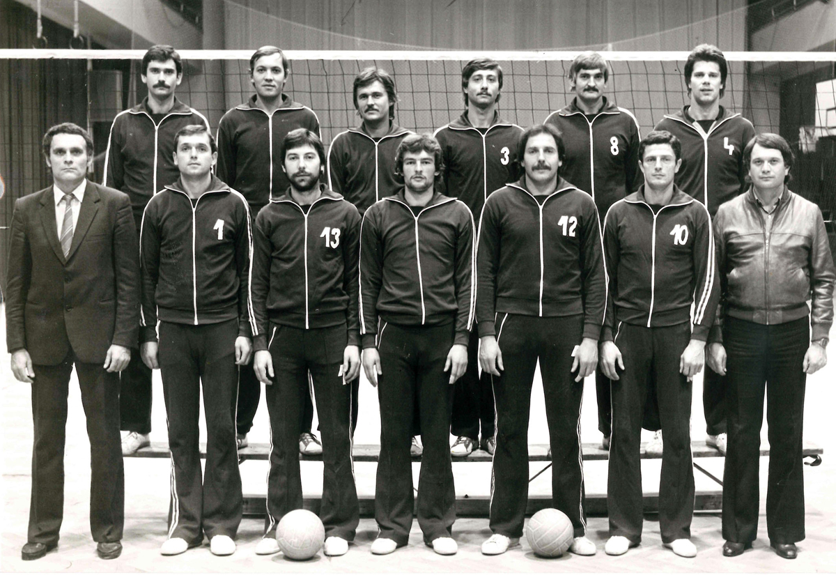 Volejbalisté budějovické Škodovky v sezoně 1981/82. Nahoře zleva Hudeček, Valach, Kopet, R. Procházka, Pitner a Voříšek, dole zleva předseda klubu Josef Hamáček, Peksa, Podruh, Hofbauer, Jindra, Kosař a trenér Zdeněk Scheichl.