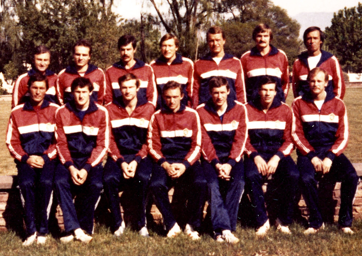 Na MS 1982 v argentinské Mendoze reprezentovala ČSSR sestava: zleva stojící první trenér Dušan Melíšek, Černoušek, Sýkora, Kopecký, Novotný, Pitner a druhý trenér Václav Šmídl, sedící zleva Prieložný, Kaláb, Krejčí, Řeřábek, K. Pavlík, Hampacher a Repák.