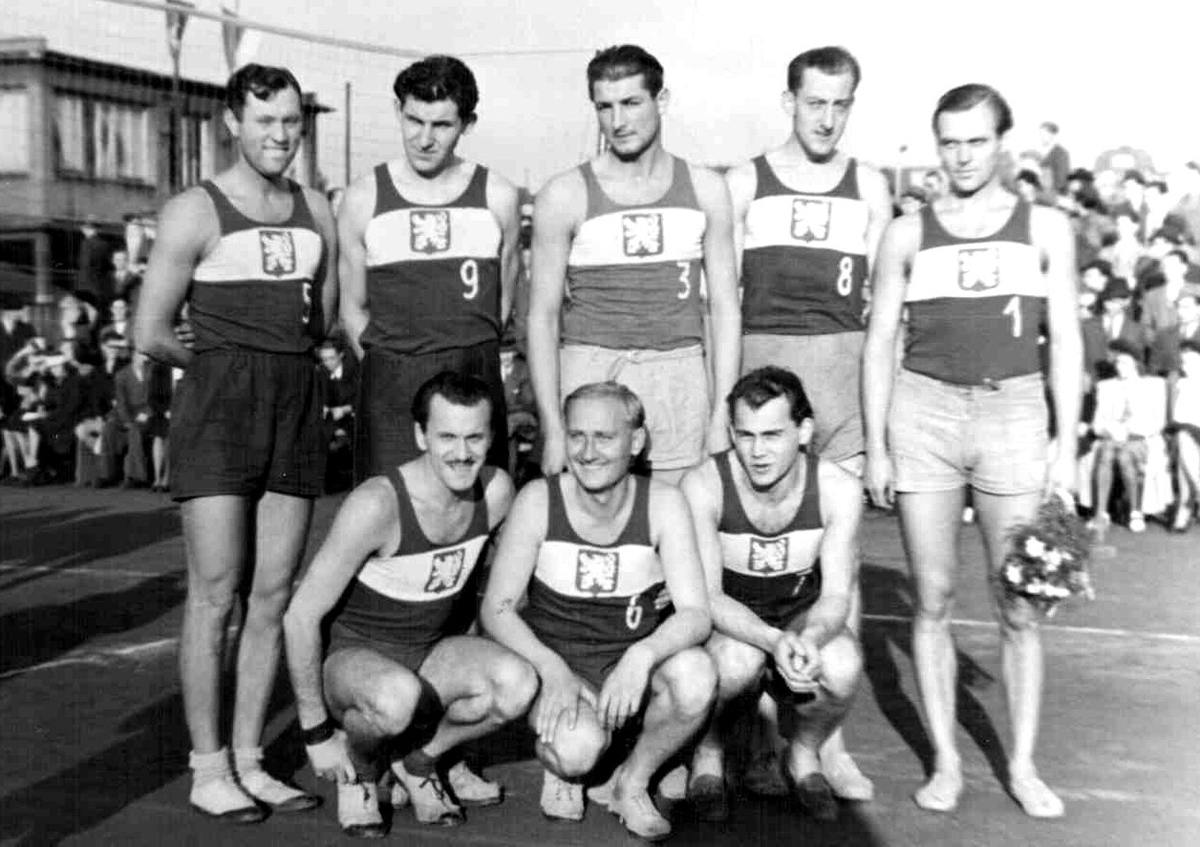 Výběr mužů ČSR, který porazil v srpnu 1946 v Praze 3:0 reprezentanty Francie, považované v té době za nejlepší tým Evropy. Zleva stojí Češpiva (Praha), Valenta (Brno), Koutský (Pardubice) a Svoboda (Praha), v podřepu zleva Chlup (Brno), Vondřich a O. Rybáček (oba Praha), Beneš (Plzeň) a Horák (Praha). Na snímku chybí desátý hráč Reicho (Praha).