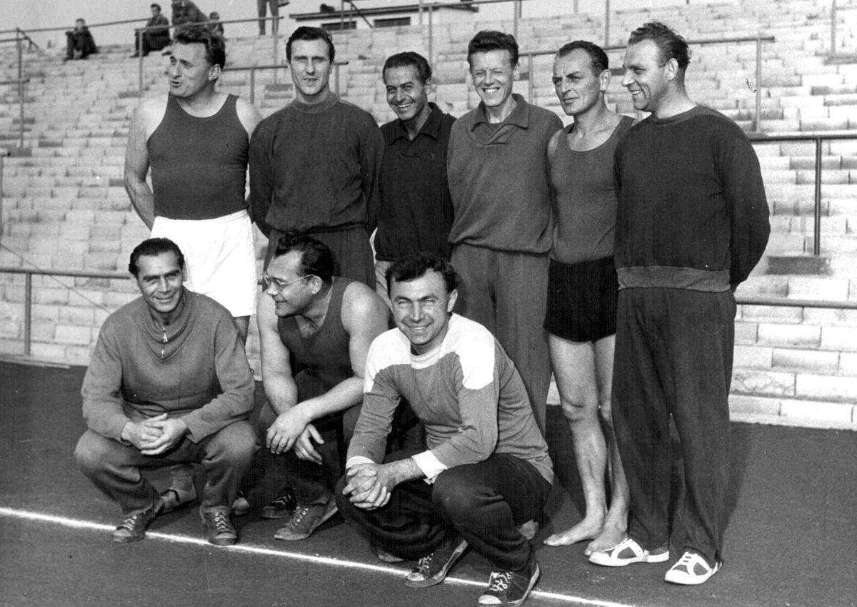 Veteráni ZMP v roce 1958 na turnaji, uspořádaném v rámci otevření volejbalového Stadionu K. Aksamita v Holešovicích. Zleva stojí Horák, Kamil Otto, Fiala, Karel Neugebauer, Bureš a Malypetr, dole zleva Josef a Otto Rybáčkovi a Strachota.