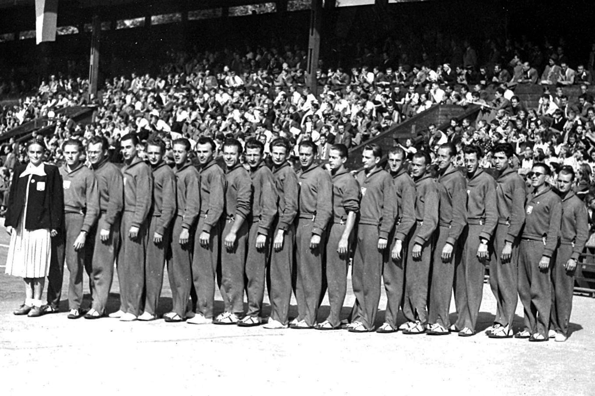 Při zahájení MS 1949 v Praze na Štvanici se divákům představil celý širší výběr volejbalistů ČSR, kteří absolvovali závěrečné soustředění v ústeckém Střekově. Zleva vedoucí přípravy Anna Stibitzová, Bouchal, Rybáček, Soukup, Votava, Paldus, Nogol, Matiášek, Fučík, Schwarzkopf, Szabó, J. Brož, Růžička, K. Brož, Mikota, Reicho, Krob, Tesař, trenér Jan Fiedler a vedoucí politické přípravy (tzv. politruk) Jaroslav Vévoda.