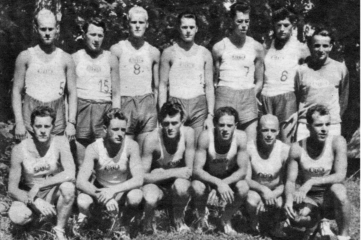 Mistrovská sestava ATK Praha v roce 1950 na MR v Jilemnici. Nahoře zleva Jonáš, Knězek, Z. Neugebauer, J. Brož, Krob, Tesař a neznámý funkcionář ATK, dole zleva Bouchal, Votava, Láznička, Paldus, Němec a Valach.