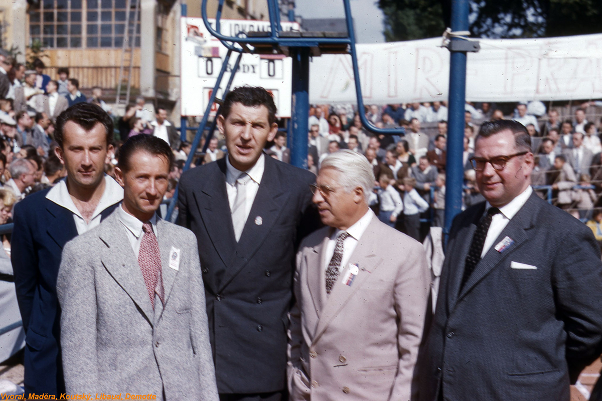 Další unikátní snímek vznikl v roce 1958 v Liberci - v rámci MS mužů a ME žen, jehož jedna skupina se hrála v tomto městě s bohatou volejbalovou tradicí. Sešly se na něm (zleva) sekretář ČSVS V. Vyoral, organizační vedoucí liberecké skupiny J. Maděra, předseda našeho svazu O. Koutský, prezident FIVB P. Libaud a člen Technické komise FIVB p. Dermott z Francie.