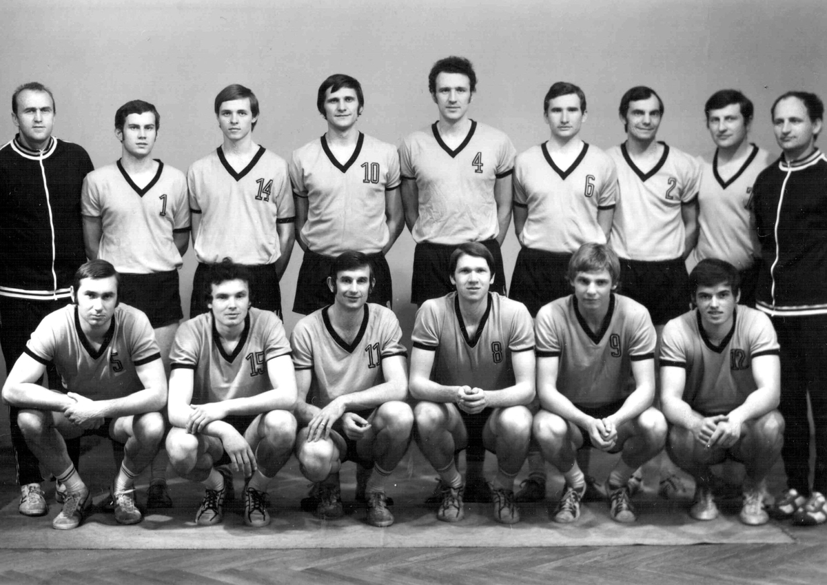 Volejbalisté Zbrojovky Brno v mistrovské sezoně 1973/74. Nahoře zleva trenér K. Láznička, Z. Cikrdle, Švestka, Bučík, Petlák, M. Turek, M. Řezníček, Vykydal a asistent trenéra J. Hrazdíra, dole zleva D. Koudelka, Reich, Čapka, Čada, Olšan a Šimáček.