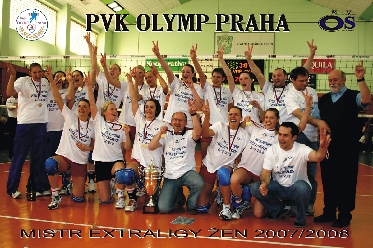 Končíme vítěznou sestavou volejbalistek Olympu v sezoně 2007/08, ve které vybojovaly zatím poslední mistrovský titul. Zleva stojí Bonnerová, Jeřábková, Halbichová, Brejchová, Duspivová, Kočiová, Havlíčková, Pyšková, Sládková, asistent trenéra P. Štulc, vedoucí družstva J. Trochta a prezident klubu V. Pirunčík, v pokleku zleva Šmídová, Háječková, Chroustovská, trenér S. Mitáč, Jakubšová, Neumannová a fyzioterapeut D. Obrda.