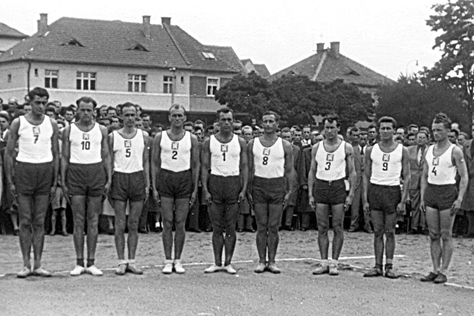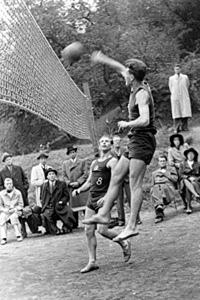 Na snímku z válečných 40. let František Stibitz (č. 8) při oblíbeném deblu ve dvojici s další legendou kolínského volejbalu - smečujícím Jaroslavem Fučíkem.