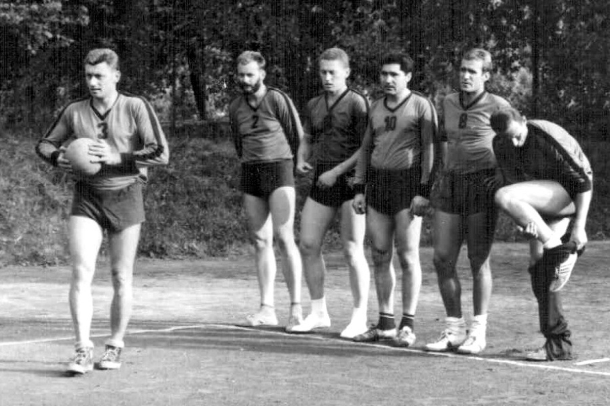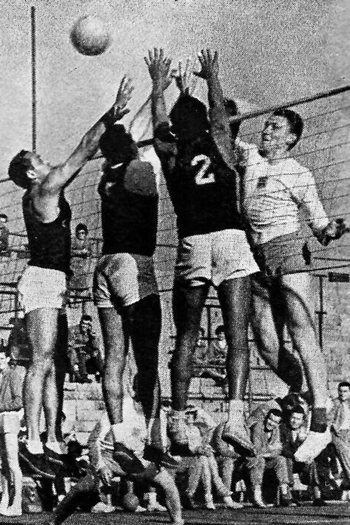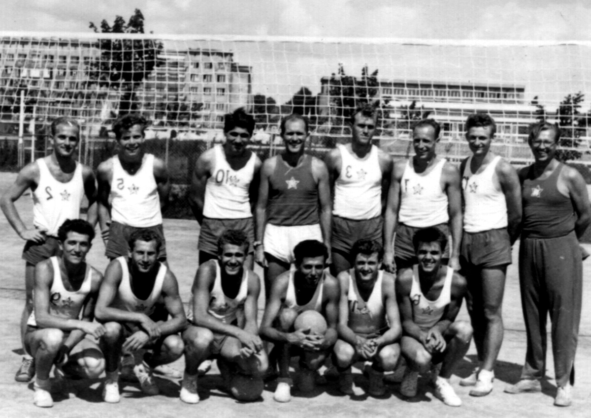 Na druhém volejbalisté Dynama Praha v roce 1958 při jednom z ligových zápasů na Starém ostrově, zleva hrající trenér E. Krob, Synovec, Hálek, Vorálek, Šorm a Kobliha. Za Hálkem je schovaný šestý hráč Matouš.