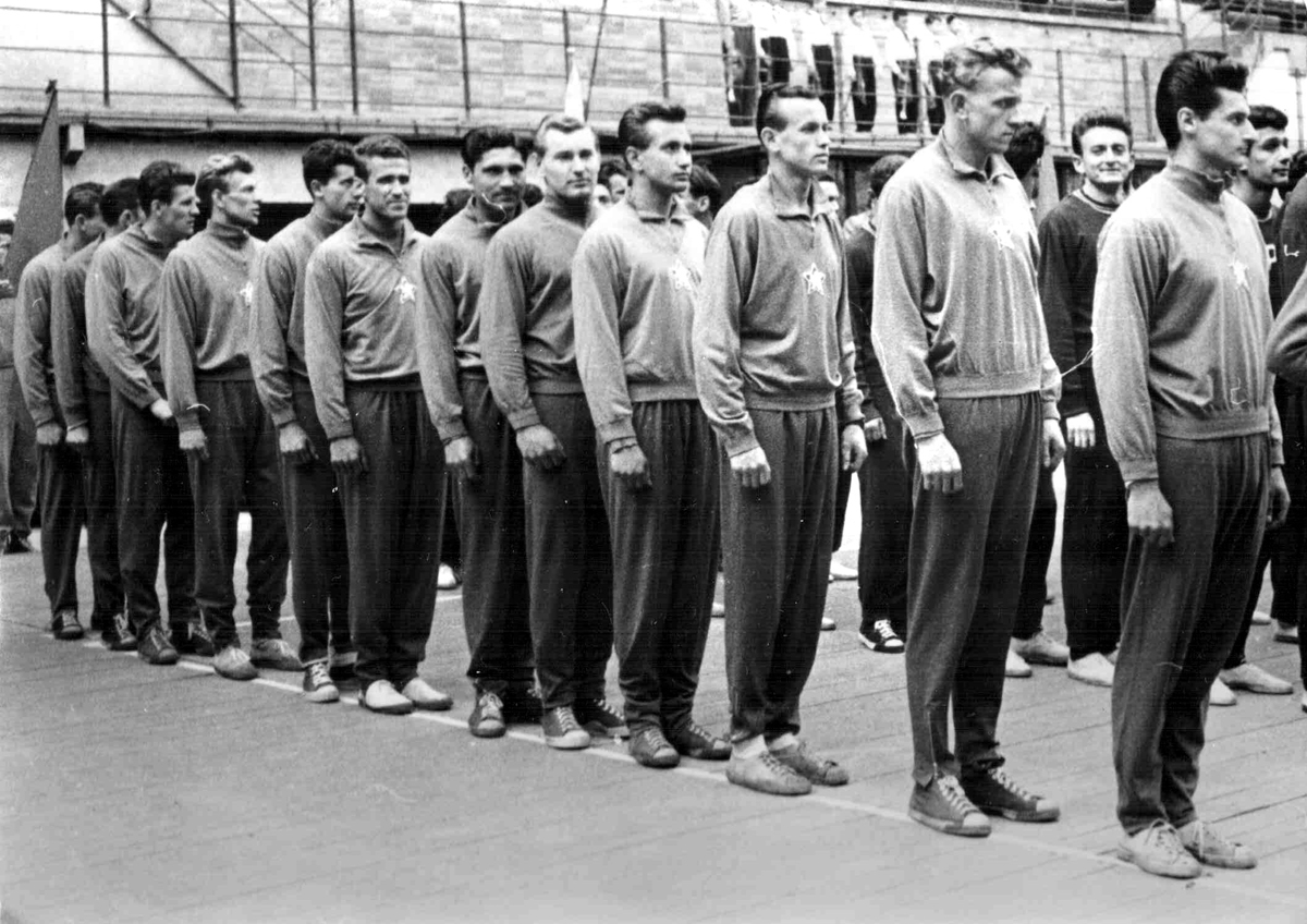 Akademici ČSSR na Albertově před odletem na „stříbrnou“ univerziádu 1963 v Brazílii. Zleva stojí trenér B. Chvála a hráči Šopa, Perušič, Pitter, Chour a Hálek, dole zleva Pospíšil, Hamáček, Labuda, Melíšek a Zenker.