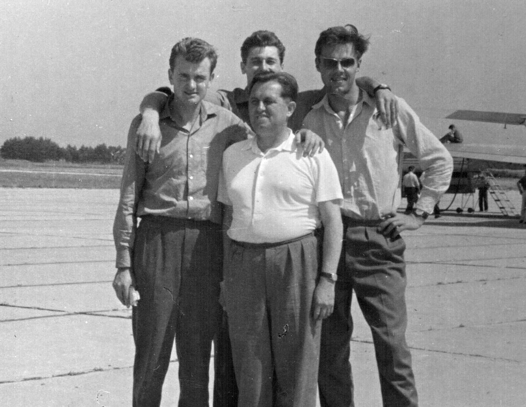 Připomeňme si jej snímkem z roku 1957, kdy byl vedoucím zájezdu RD mužů do Rumunska. Na letišti spolu s ním zleva Synovec, Šašinka a Purnoch.