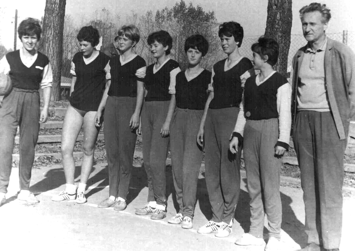 Na snímku z roku 1966 Zuzana Malá třetí zleva ještě s týmem dorostenek Slavoje Braník, napravo trenér Jiří Němeček.