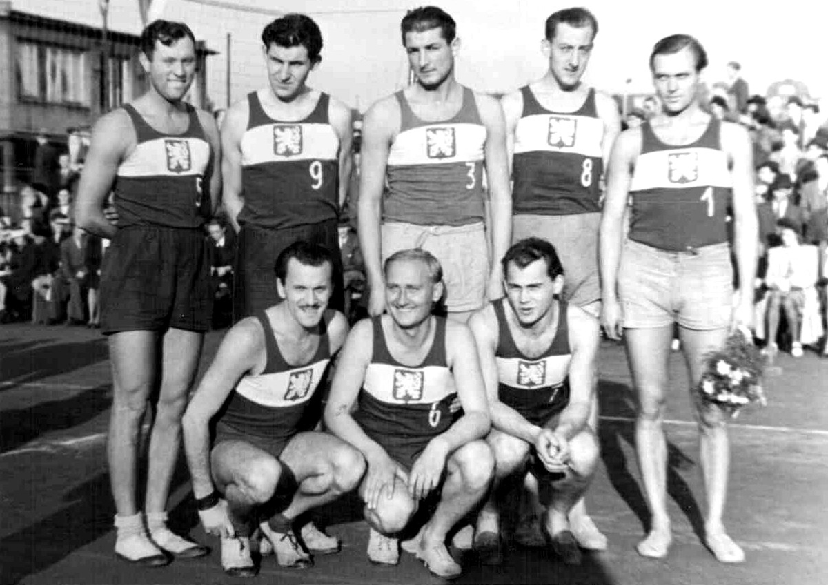 Na dalším snímku výběr volejbalistů Čech při jednom z tradičních zápasů „Čechy-Morava“, která nepřerušila ani válečná léta a na kterých hráči mohli nosit na prsou zemské znaky (Češi lva, Moravané orlici). Snímek je z roku 1943, zleva stojí Bočan alias „Mydlina“ (SK Viktoria Plzeň), „Otyla“ Koutský (SK Pardubice), Svoboda (SK Slavia Praha), Reicho (SK Philips) a Klíma (SK Slavia Praha), dole zleva Těšitel (SK ZMP), Bulena (SK Philips) a O. Rybáček (SK ZMP).