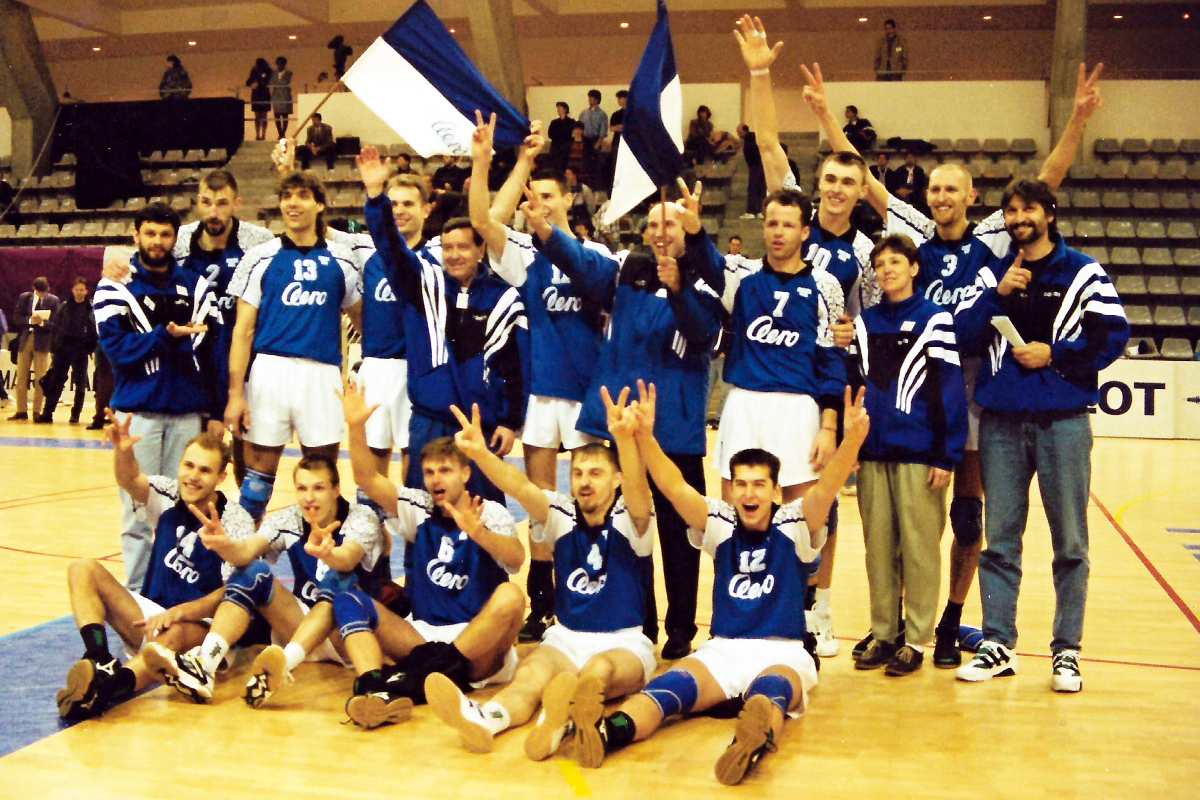 Volejbalisté Aera po skončení finálového turnaje Poháru CEV v roce 1996 v Paříži, na kterém obsadili 3. příčku. Zleva stojí manažér týmu V. Bednář, hráči Michal, M. Kvapil, Salák, masér A. Štamfest, Svoboda, vedoucí družstva a asistent trenéra J. Neumann, Palinek, Karabec, MUDr. Otčenášková, Pakosta a trenér P. Třešňák. Zleva sedí Holčík, Kovařík, M. Kop, Zita a T. Malčík.