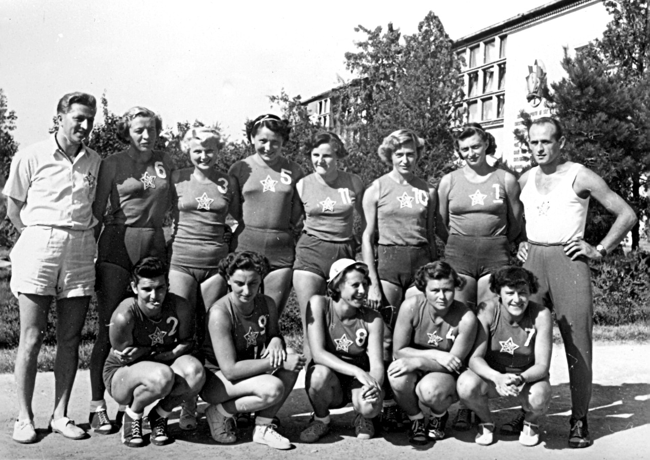 Po úspěchu v Bukurešti se „až“ 4. místo našich volejbalistek na MS 1956 v Paříži stalo zklamáním nejen pro naši volejbalovou veřejnost, ale i pro hráčky samotné. O jednu z medailí je připravily prohry se Sovětkami (tentokrát hladce 0:3), s Rumunkami a Polkami (shodně 2:3 po boji). Na snímku zleva stojí držitelky „bramborových“ medailí (co bychom za ně dnes dali?): Štaudová, Holá, Nečasová, Kučerová, Svozilová a Valášková, dole zleva Neugebauerová, Štulcová, Moravcová, Šindelářová, Lútočková a Matalíková, trenérem stále M. Mácha.