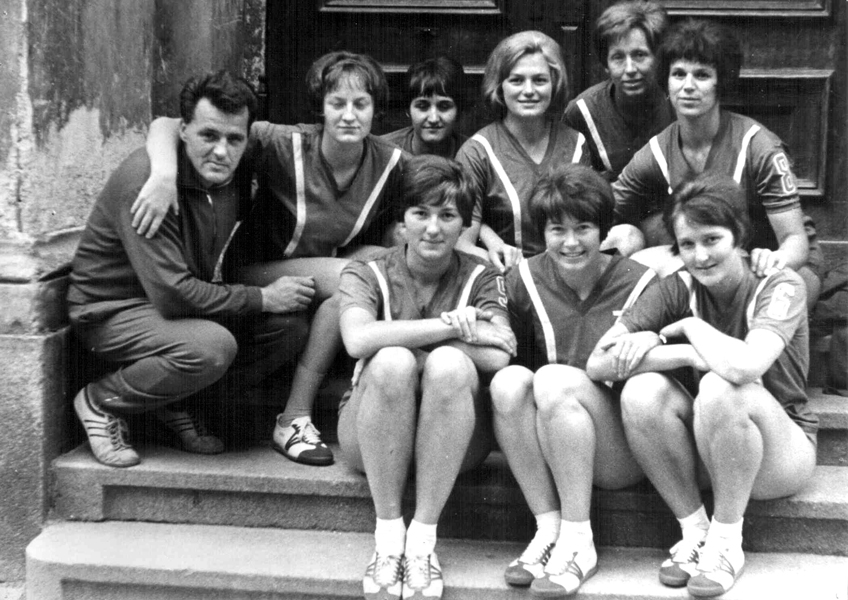 Další snímek volejbalistek Jablonce je z roku 1968, kdy skončily v I. lize na 5. místě a poprvé pod názvem Bižuterie Jablonec, podle svého štědrého sponzora. Na schodech v horní řadě zleva trenér Kukula, Poláková, Elgerová, Procházková, Šimková a Höferová, přední řada zleva Hrádková, Kukulová a Štruplová.