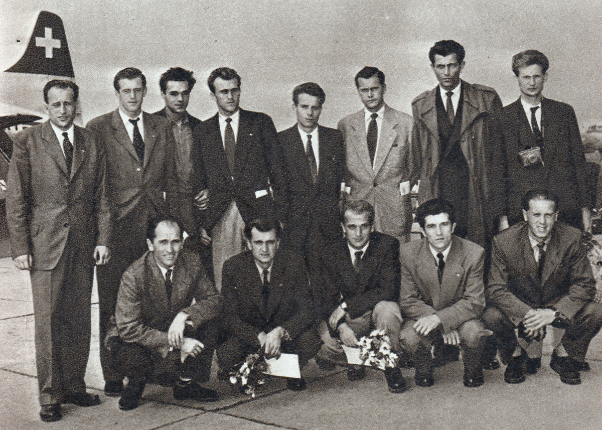 Mistři světa 1956 po příletu z Paříže, zleva stojí Malý, Karel Brož, Purnoch, Láznička, Musil, Josef Brož, Tesař a Schwarzkopf, dole zleva trenér Josef Kozák, Synovec, Paulus, Golian a Paldus./