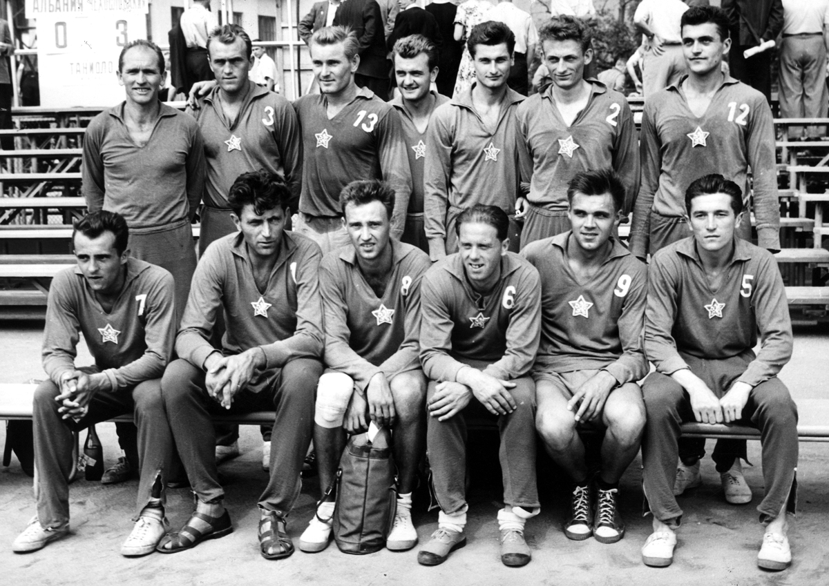 Stříbrný výběr volejbalistů ČSR na Světovém festivalu mládeže a studentstva v Moskvě roku 1957. Nahoře zleva trenér Kozák, Láznička, Rozsíval, Synovec, Šašinka, Kemel a Veselko, dole zleva Šinský, Tesař, Humhal, Paldus, Purnoch a Golian.