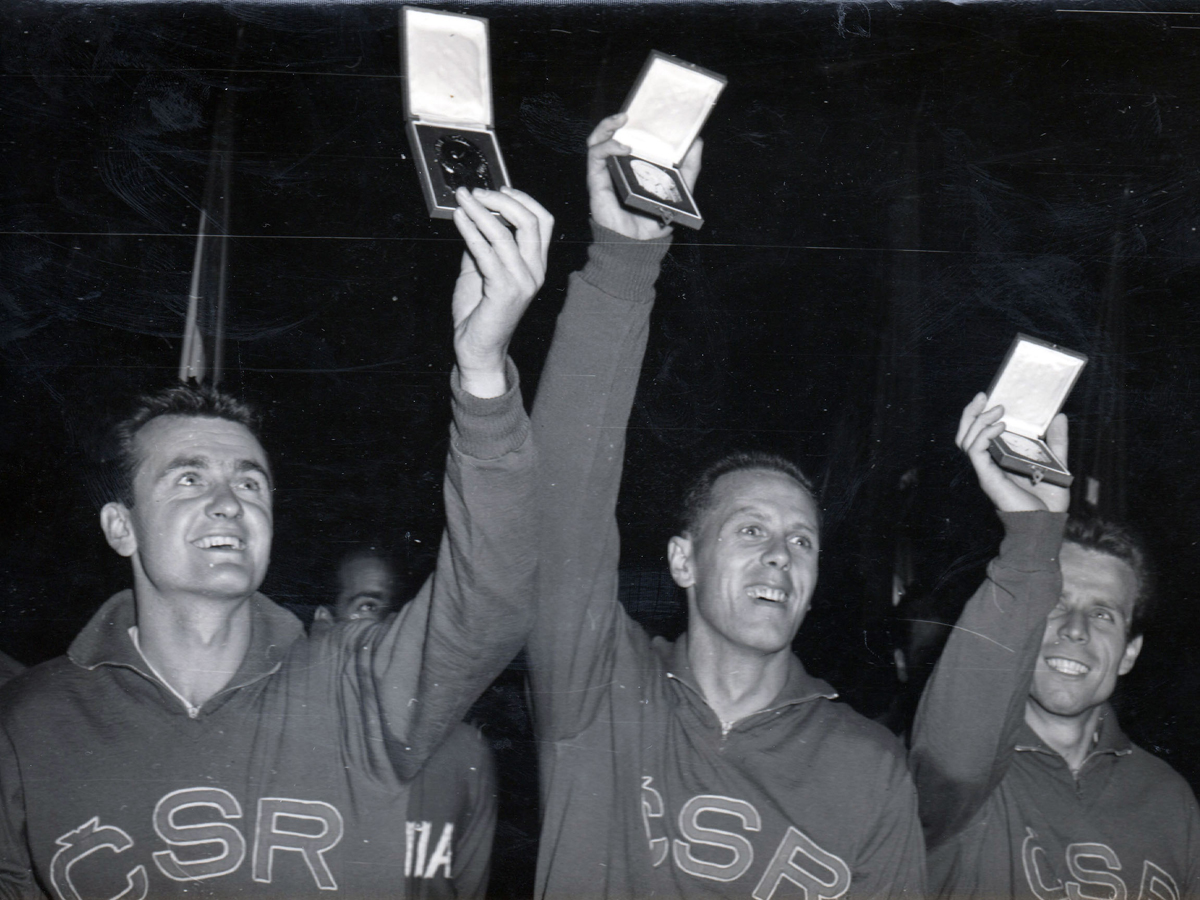 Triumf volejbalistů ČSR na pražském ME v roce 1958 připomíná snímek trojice Mistrů Evropy s medailemi při slavnostním zakončení šampionátu na Zimním stadionu pražské Štvanice. Zleva Ladislav Synovec, Jaromír Paldus a Josef „Bulda“ Musil.