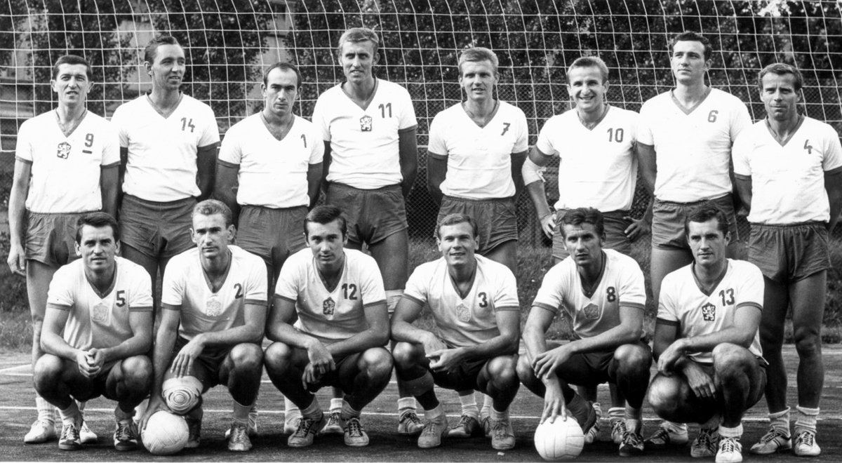 V roce 1968 si Drahoš přivezl z mexické olympiády bronzovou medaili, která společně se zlatem z pražského MS patřila k jeho nejcennějším trofejím. Na snímku ještě širší výběr pro OH, nahoře zleva Golian, Sokol, Procházka, Pavel Schenk, Groessl, Petlák a Musil, dole zleva Smolka, Svoboda, Drahoš Koudelka, Mozr, Labuda a Lubomír Zajíček.