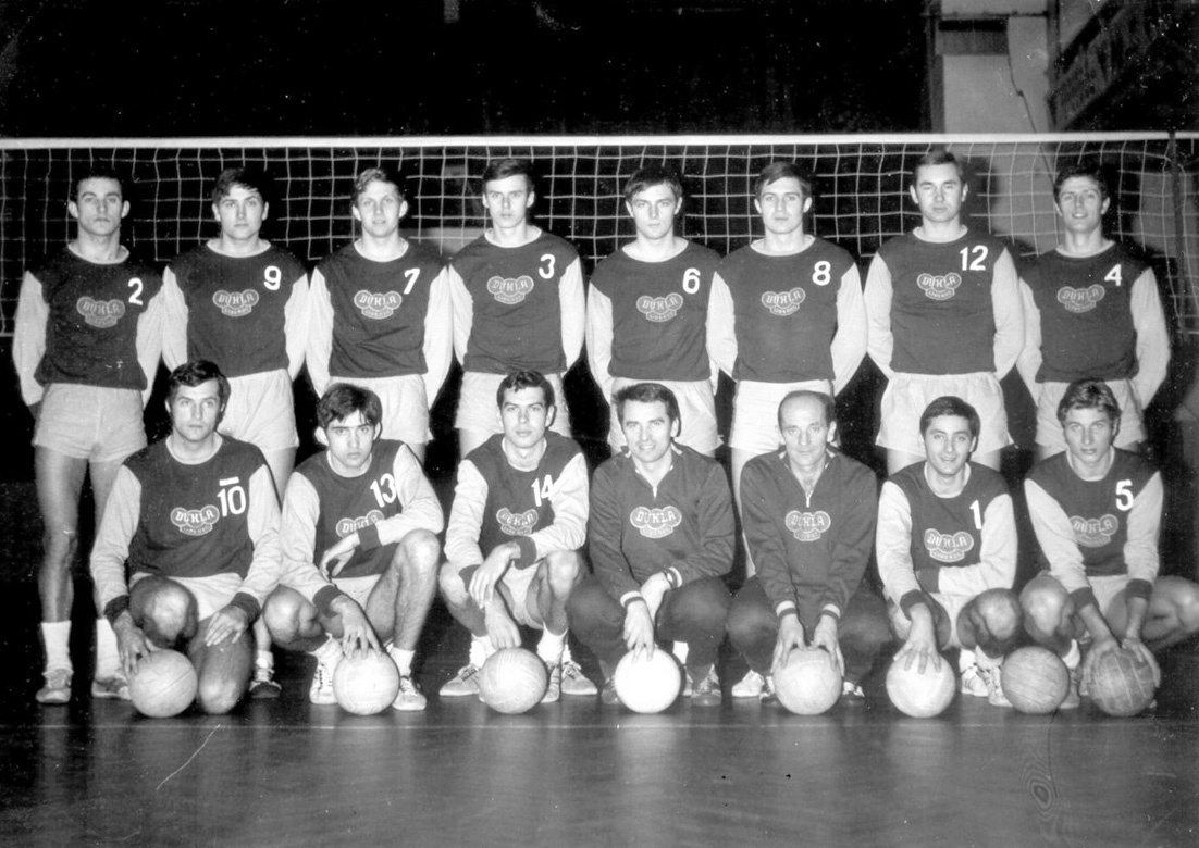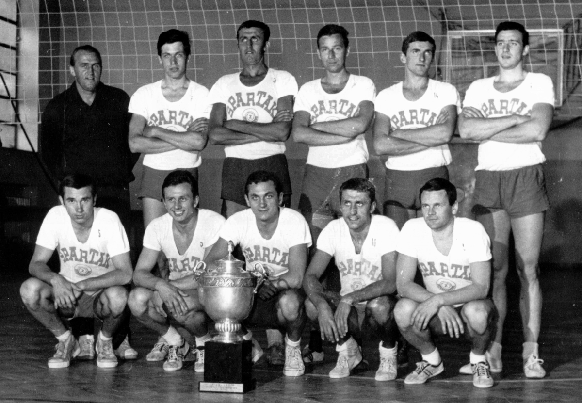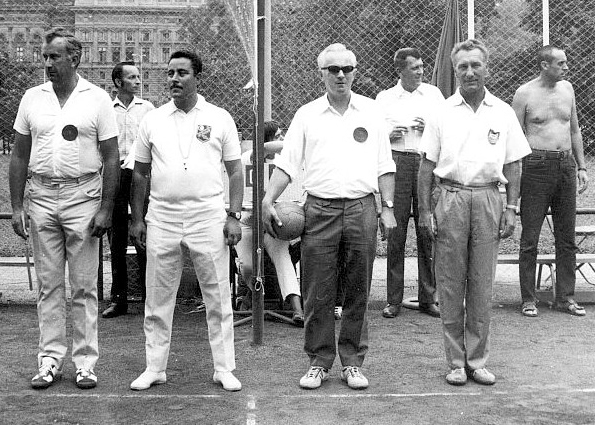 Po 10 letech od zisku prvního mistrovského titulu hráči Rudé hvězdy Praha se v roce 1977 uskutečnil v hale v Přípotoční ulici turnaj „vysloužilců“ několika ligových družstev. Na snímku vítězný domácí celek, zleva stojí kouč Karel Brož, v civilu Rehberger, Čuda, Štěpánek, Vykoukal, Petr Kop a Drobný, dole zleva Paldus, Groessl a Vápenka.