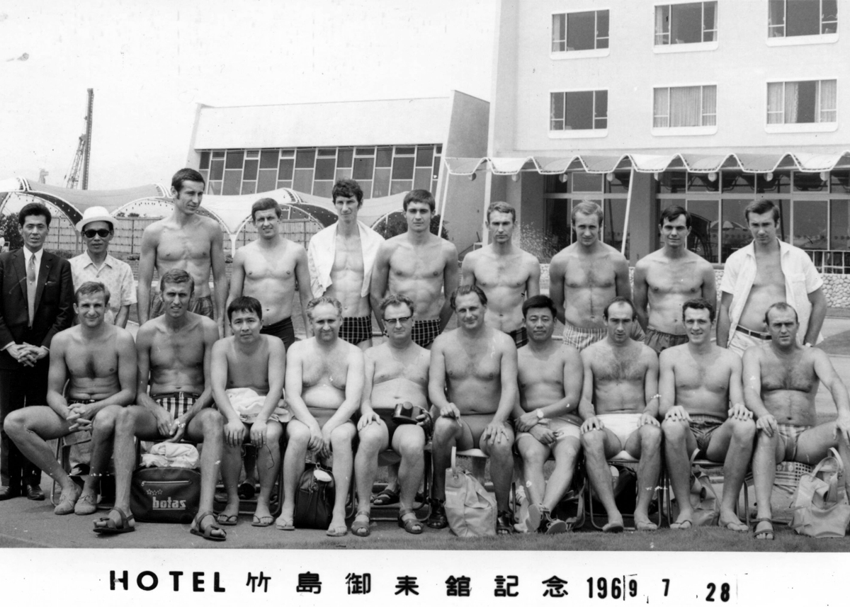Další unikátní snímek vznikl při zájezdu RD mužů ČSSR do Japonska v roce 1969. Nahoře zleva napůl svlečení hráči Vápenka, Petr Pavlík, Miloš Lehký, Tomáš, Svoboda, Fiala, Milan Řezníček a Drahoš Koudelka. Sedící zleva Groessl a Petr Schenk, sedící zprava trenér Láznička, Petlák a Procházka.