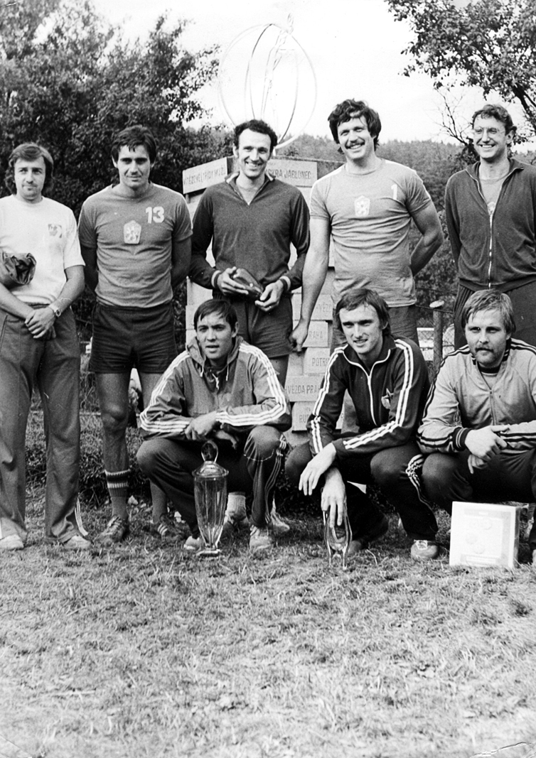 Na dalším osmička reprezentantů ČSSR na turnaji v Dřevěnici v roce 1979, na kterém startovali v rámci přípravy na ME a který bez problémů vyhráli. Zleva stojí Sirvoň, Tomáš, Petlák, Stančo a Vondrka, dole zleva Valach, Řeřábek a Šmíd.