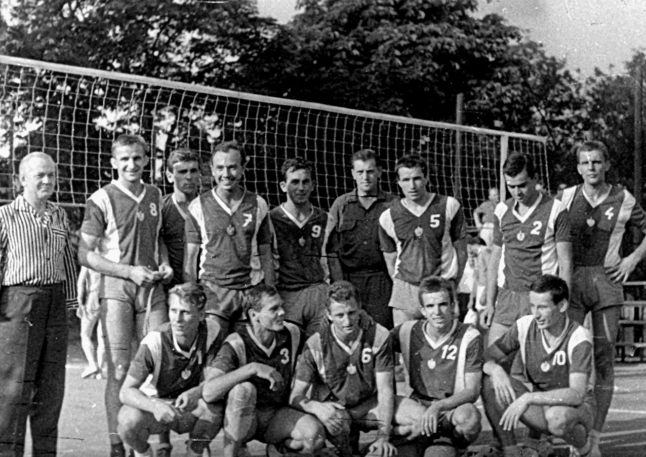 Mistři ČSSR pro rok 1965 - volejbalisté Spartaku Brno ZJŠ. Nahoře zleva vedoucí družstva Z. Velan, Handlíř, Petlák, Pavčo Schenk, D. Koudelka a Lípa, dole zleva hrající trenér Láznička, Procházka, Václavík, Uherek a Derka. Z vítězného kádru na snímku chybí hráči Ovesný, Petr Schenk a L. Zajíček.